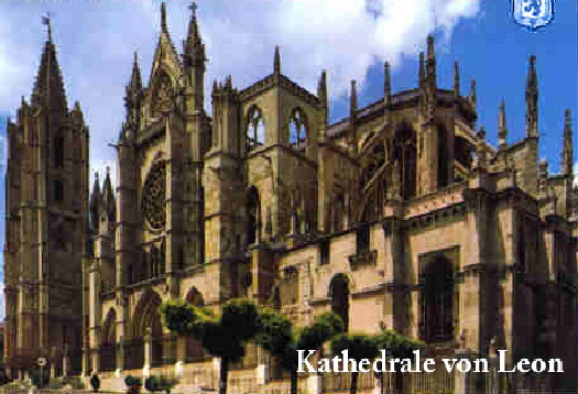 Nachdem wir um 8 Uhr in Mansila de las Mulas aufgebrochen waren, erreichten wir schon um 11,30 Uhr die Vororte von Leon. Die Strecke war sehr unangenehm zu gehen. Sie führte oft über größere Straßen und über eine große Brücke, wo wir dicht neben dem starken Autoverkehr gehen mußten. Dabei drohte es jeden Augenblick zu regnen anzufangen. Es ging aber gut, sodaß wir Leon mit trockener Kleidung erreichten. Zum Gehen war das Wetter jedenfalls besser, als wenn große Hitze geherrscht hätte. In Leon angekommen, stärkten wir uns erst mal auf einer Bank unter einer großen Platane. Bei nun einsetzendem leichten Nieselregen suchten wir unser ausgewähltes Quartier bei den Madres Benediktineros in der Calle Esturial auf. Die Herberge wurde aber erst um 16 Uhr geöffnet, trotzdem wies uns eine freundliche Schwester einen Raum an, in dem wir unser Gepäck schon abstellen durften.