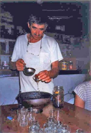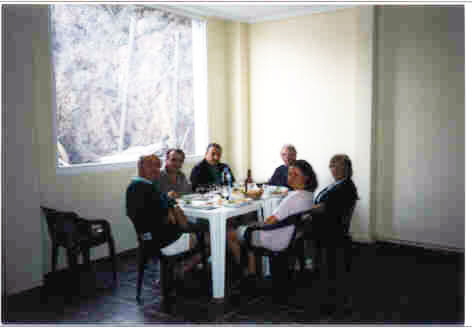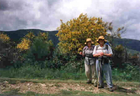 Der Regen ließ auch nicht lange auf sich warten, darum streiften wir unsere Umhänge über. Dabei herrschte ein starker Wind, fast konnte man sagen, ein Sturm. Der trieb die Regenwolken aber schnell vorüber, sodaß wir fast nicht naß wurden. Unser Zeug wurde nur etwas feucht, aber der Wind trocknete das Zeug am Körper, wenn wir wirklich mal ein bißchen naß wurden. So erreichten wir gegen 10 Uhr die Herberge in Gonzar, wo wir vor 2 Jahren schon einmal übernachtet hatten und eine überaus gastfreundliche Frau angetroffen hatten. Wir zeigten dem Mann, den wir in der Herberge antrafen, die Fotos von unserer 1995er Wanderung. Daraufhin ging er gleich mit uns zu seiner Frau, die uns sofort wiedererkannte und sich riesig über unseren Besuch freute. Sie lud uns gleich zum Kaffee ein und bewirtete uns auf das Freundlichste. Wir stärkten uns mit selbstgebackenem Brot und Käse und verständigten uns so gut es ging. Mit einer herzlichen Umarmung wurden wir auf unserem weiteren Caminogang entlassen, nachdem wir versprochen hatten, aus Deutschland zu schreiben und einpaar Fotos zu schicken, die wir in der Küche aufgenommen hatten.